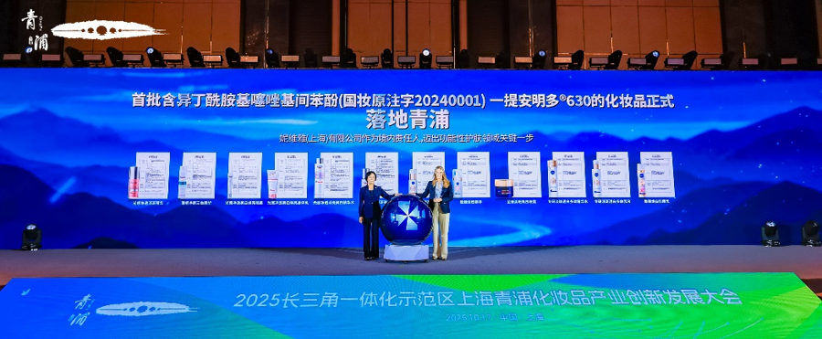 大会现场,首个美白祛斑新原料提安明多®630的化妆品落地青浦,成为上海化妆品产业政策落地的“标杆案例”。该原料历时15年研发、9年申报,2024年11月获批,是《化妆品监督管理条例》实施后首个通过国家药监局审查的美白祛斑类新原料。从2021年进博会引入,到2024年获批、2025年投产上市,关键节点均在青浦完成,形成真正意义上的“全链路创新故事”。背后是国家药监局、上海市药监局及青浦区政府的政企协同,彰显“上海速度”与政策效能。